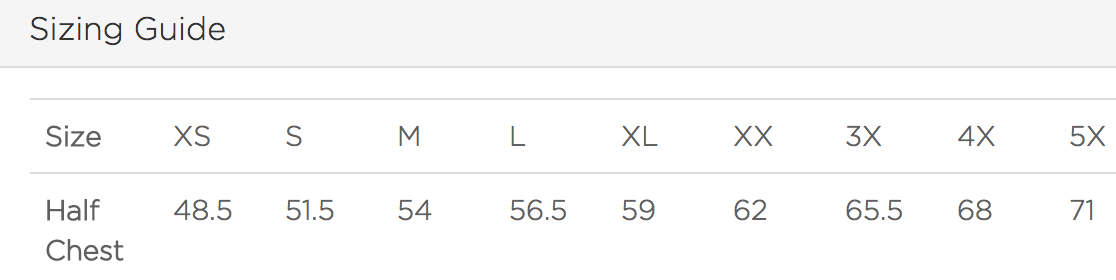 Half Chest (cm) 50 52 54 56.5 59 62 65 68 71 73.5 76
