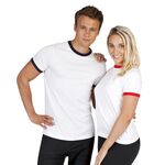 Contrasting ribbing at neck & sleeve hems, side seamed, shoulder to shoulder tape, double needle hems, preshrunk to minimise shrinkage